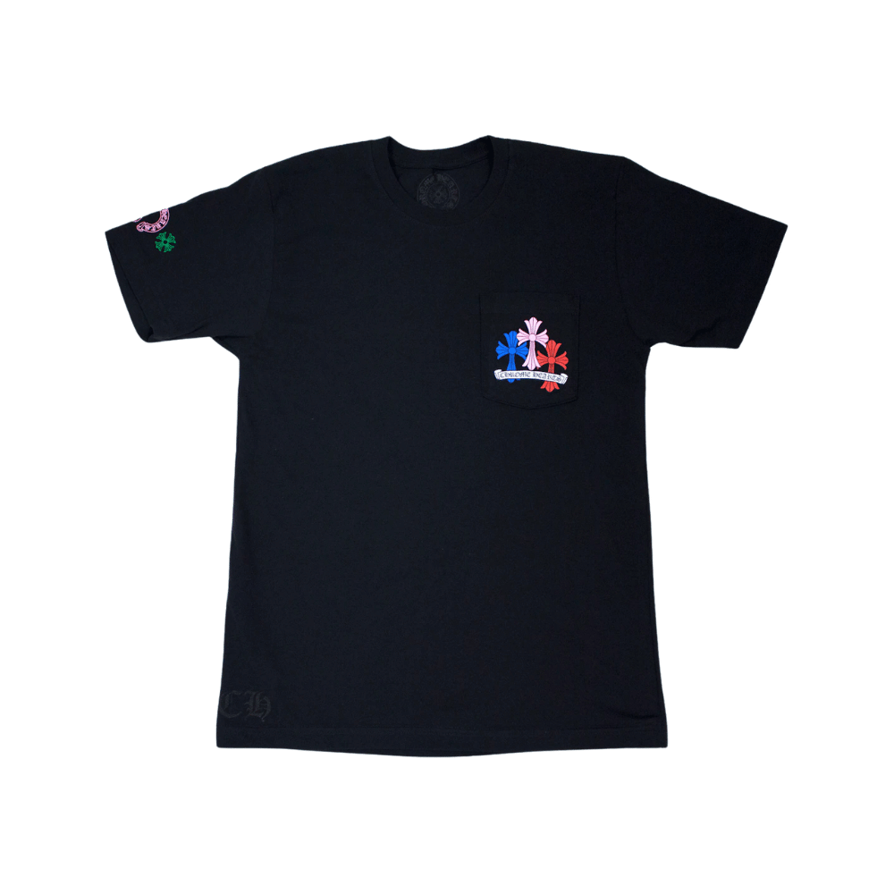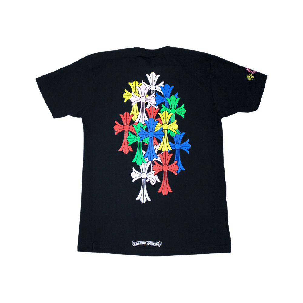 The Chrome Hearts Multi Color Cross Cemetery T Shirt in black features a bold cluster of vibrant cross graphics on the back in red, blue, green, yellow, pink, and white. Crafted for a standout streetwear look, this tee blends signature Chrome Hearts style with everyday comfort.